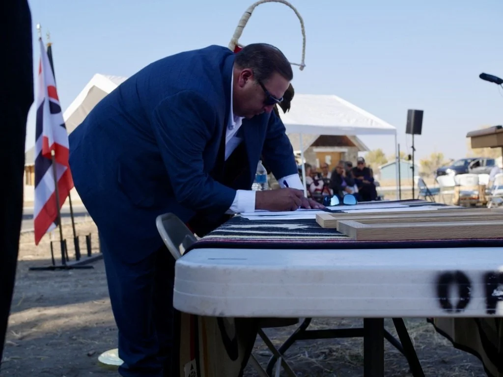 Then, members of the Episcopal Church and the Northern Arapaho Business Council sign a paper, legally transferring the collection back to the tribe. And the items are officially home, with a victory song to celebrate.